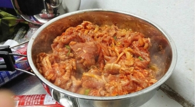 이대로 반찬 뚜껑을 닫아 숙성시켜주면 되는데요, 냉장고에서 3~4일간 보관이 가능하다고 해요. 채소는 버무리지 말고 고기 위에 살포시 올려줘요. 채소에 소금을 따로 뿌려방치하면 아삭함을 살릴 수 있어요. 1~2일 냉장 숙성 후 섭취하는 것이 가장 맛있다고 해요.달군 프라이팬에 양념한 고기를 올려 구워줘요. 이 때 뒤적이지 말고 노릇해질때까지 기다려주는 것이 포인트라고 해요. 아래쪽 표면에 거뭇거뭇한 부분이 생기면 모두에게 섞어가며 볶다가, 대파+양파와 국물 적당량을 넣어 한 번 뒤적여주세요.